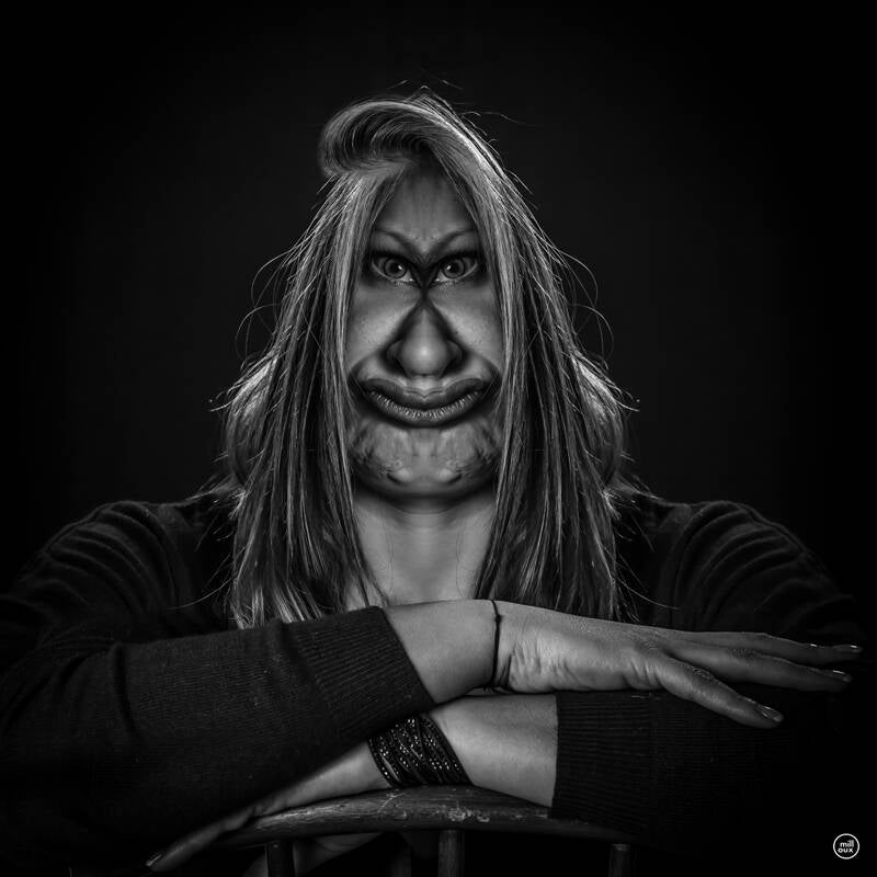 Chaque cliché est un assemblage symétrique d’un demi-visage grimaçant, figé dans une ambiance obscure et close, à la manière d’une curiosité de cabinet translucide qui baignerait dans du formol noir.